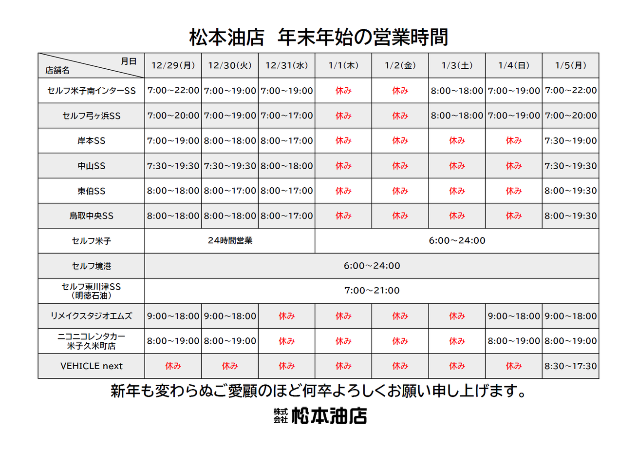 年末年始の店舗営業時間については、下画像の通りとなります。