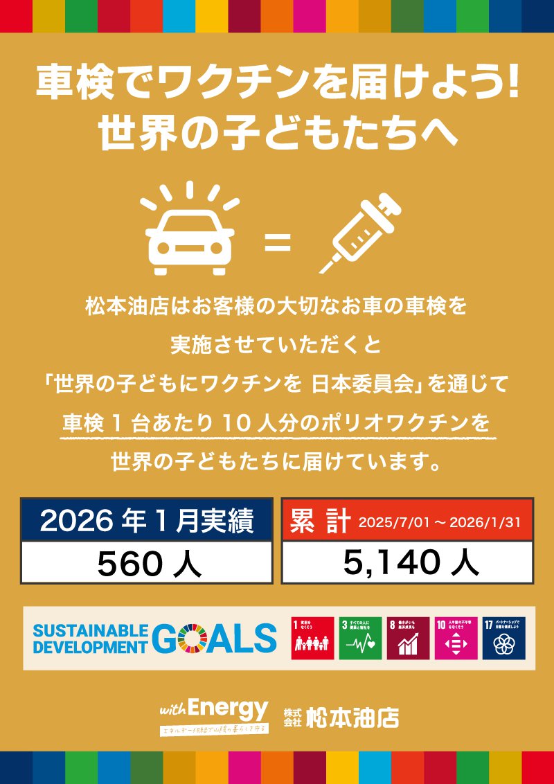 松本油店でお客様の大切なお車の車検を実施させていただくと「世界の子どもにワクチンを 日本委員会」を通じて1台あたり10人分のポリオワクチンを世界の子どもたちに届けています。